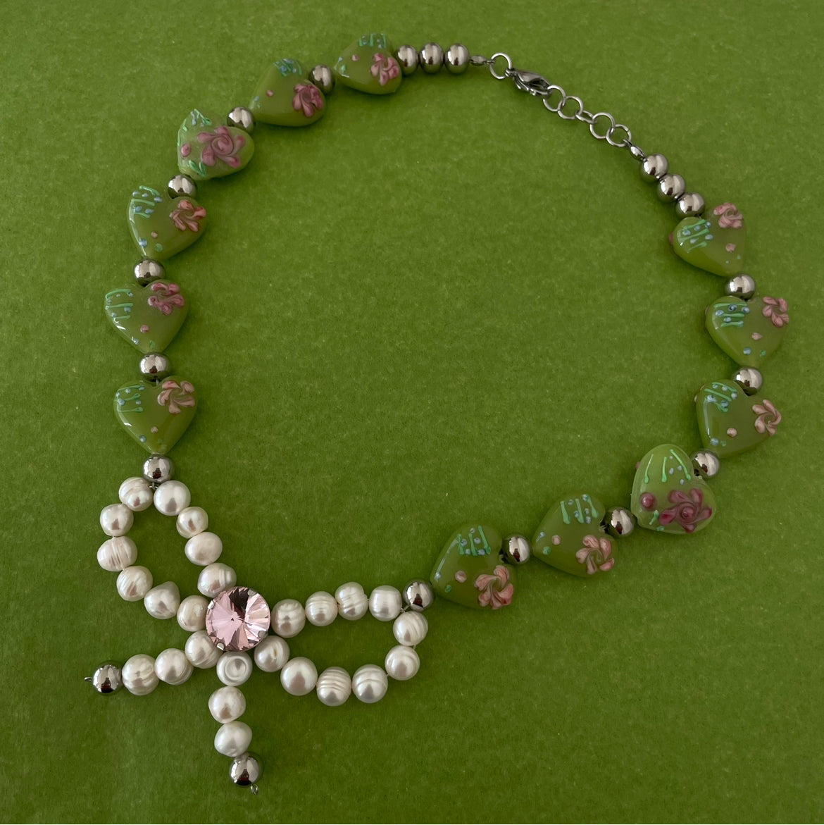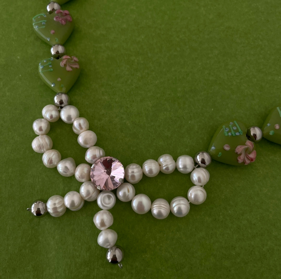 15 inches bow necklace handmade with fresh water pearls, rhinestone with a metal mount, handmade Murano beads and stainless steel beads