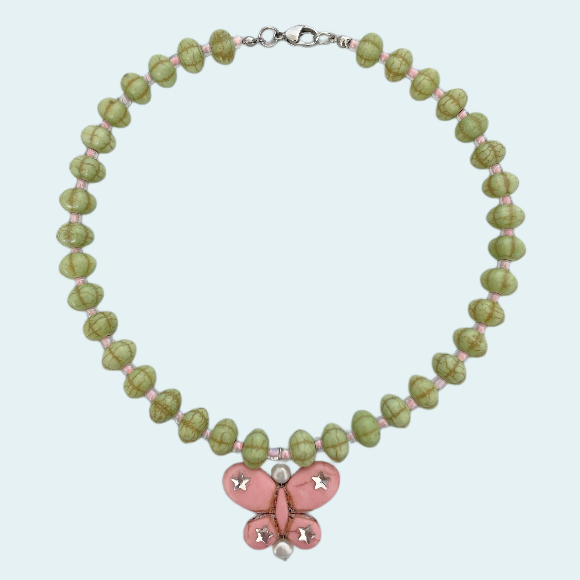 15inches made with: freshwater pearls, star-shaped rhinestones, & a variety of different turquoise stones